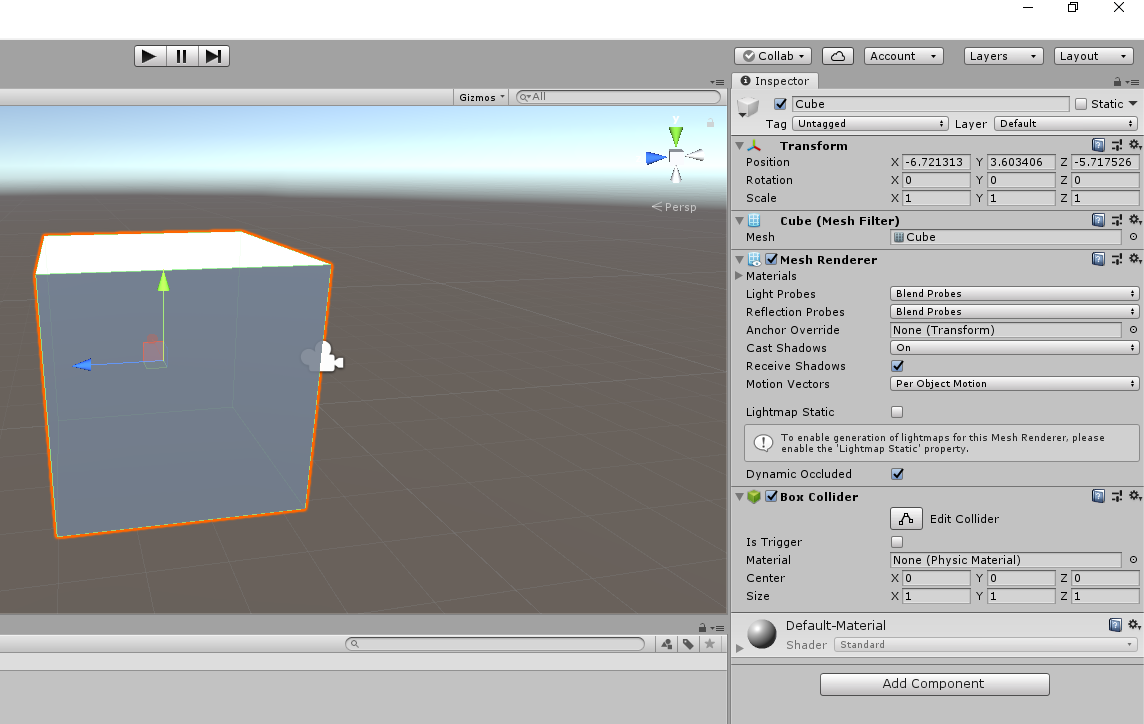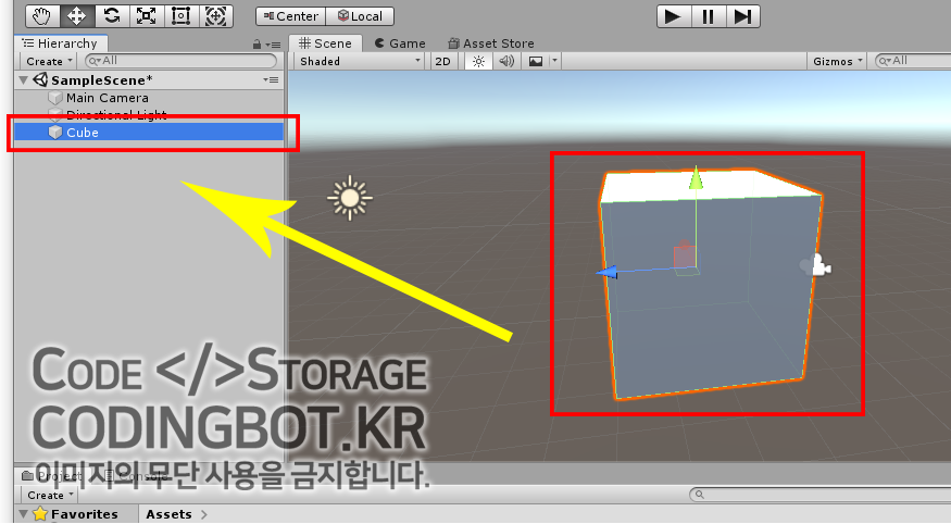 위와 같이 Scene뷰 중앙에 정육면체가 나타났다면 성공적으로 추가한 것입니다. 동시에, Hierarchy 창에도 Cube가 추가됩니다. 이와 같이 Scene뷰에 있는 오브젝트들이 모두 Hierarchy창의 오브젝트 목록과 대응된다는 것, 잊지 마세요!