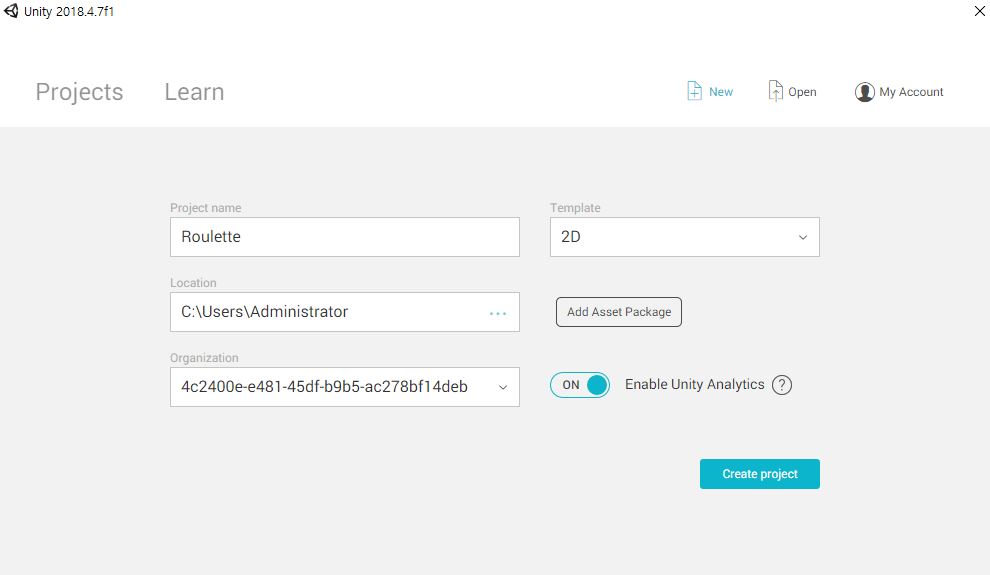 먼저 프로젝트 부터 만들겠습니다. 유니티 시작화면에서 New를 누르거나, 유니티 에디터에서 File > New Project를 누릅니다. 프로젝트 이름은 Roulette, 템플릿은 2D로 합니다.