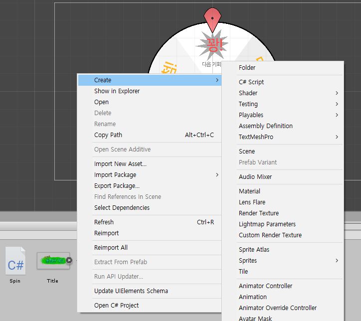 이제 회전판을 회전시켜주는 Spin 스크립트를 작성하겠습니다. 프로젝트 창에서 우클릭하고 Create > C# Script 를 선택합니다. 스크립트 이름은 Spin 으로 하겠습니다.