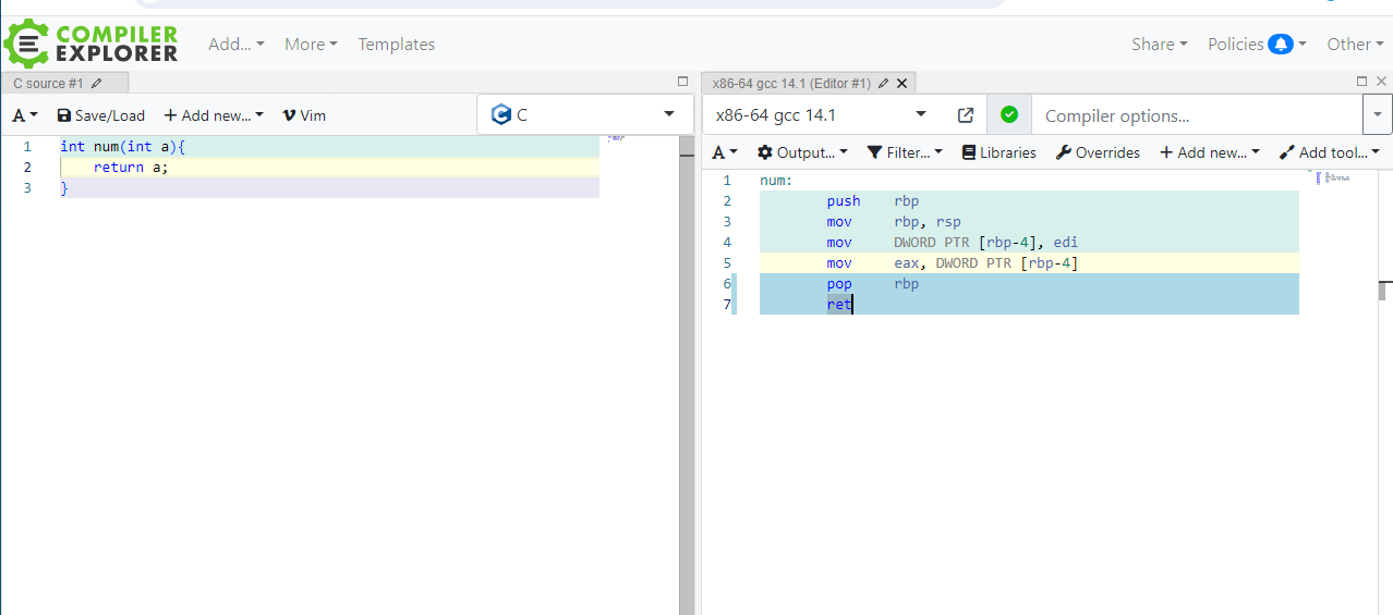 여러가지 언어로 작성한 프로그램 코드를 다양한 컴파일러를 이용해 어셈블리어로 변환하여 확인해볼 수 있는 사이트가 있다. https://godbolt.org/ 에 접속하면 온라인 환경에서 코드를 작성해보고 이를 컴파일러를 이용해 어셈블리어로 변환해볼 수 있다.